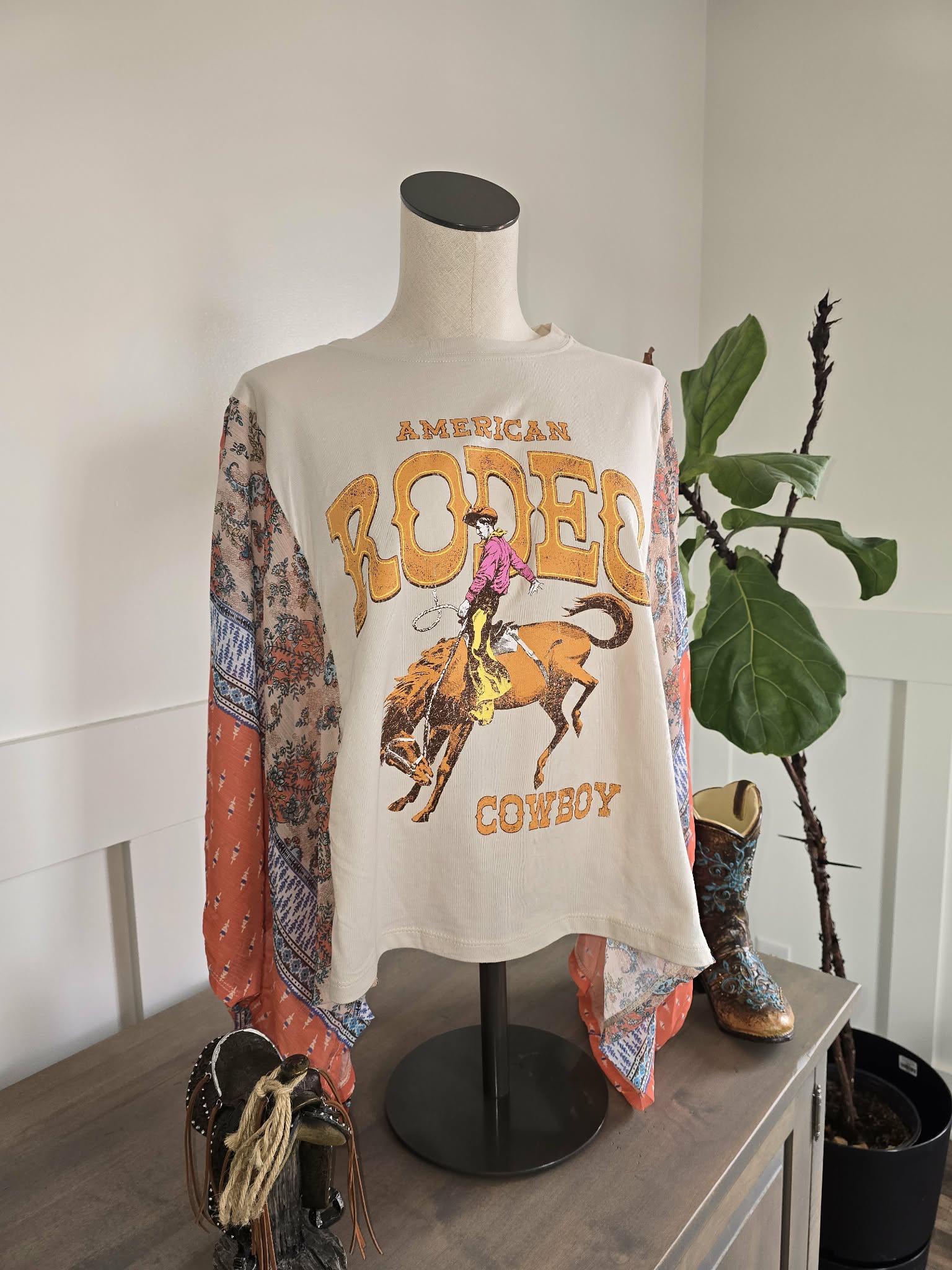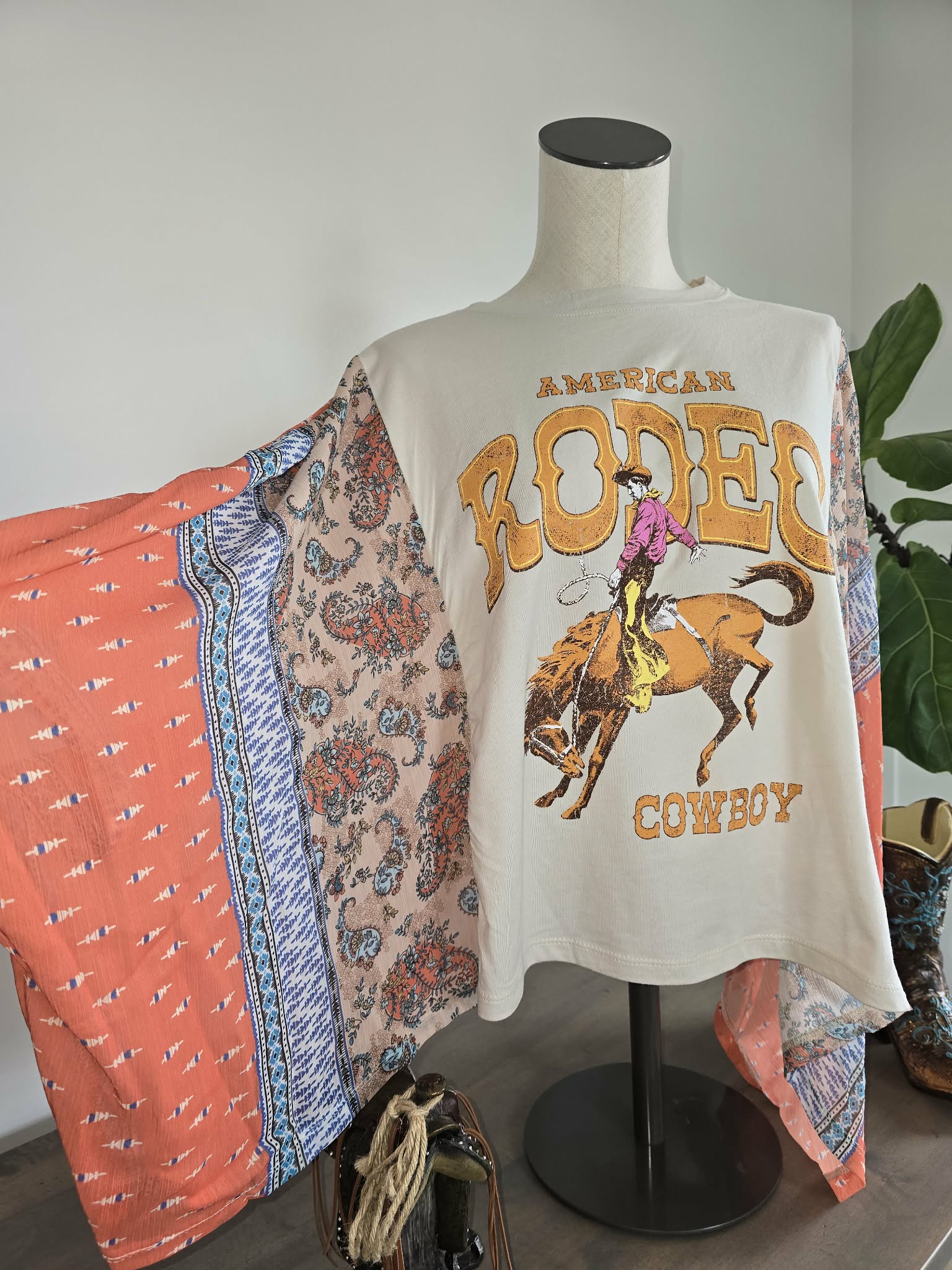 American rodeo graphic tee with a multi print kaftan top featuring lightweight, breathable fabric and flowy contrast sleeves
