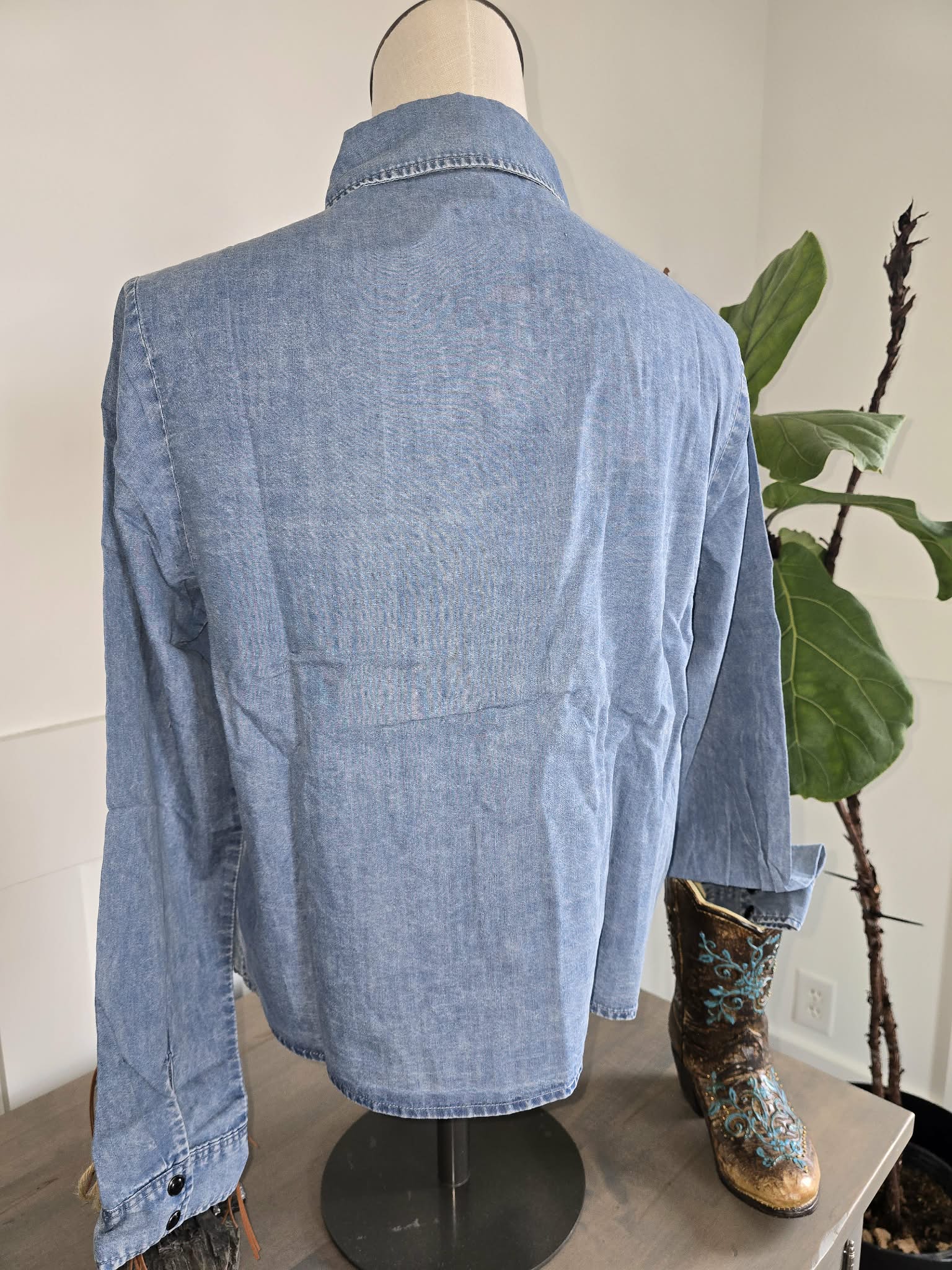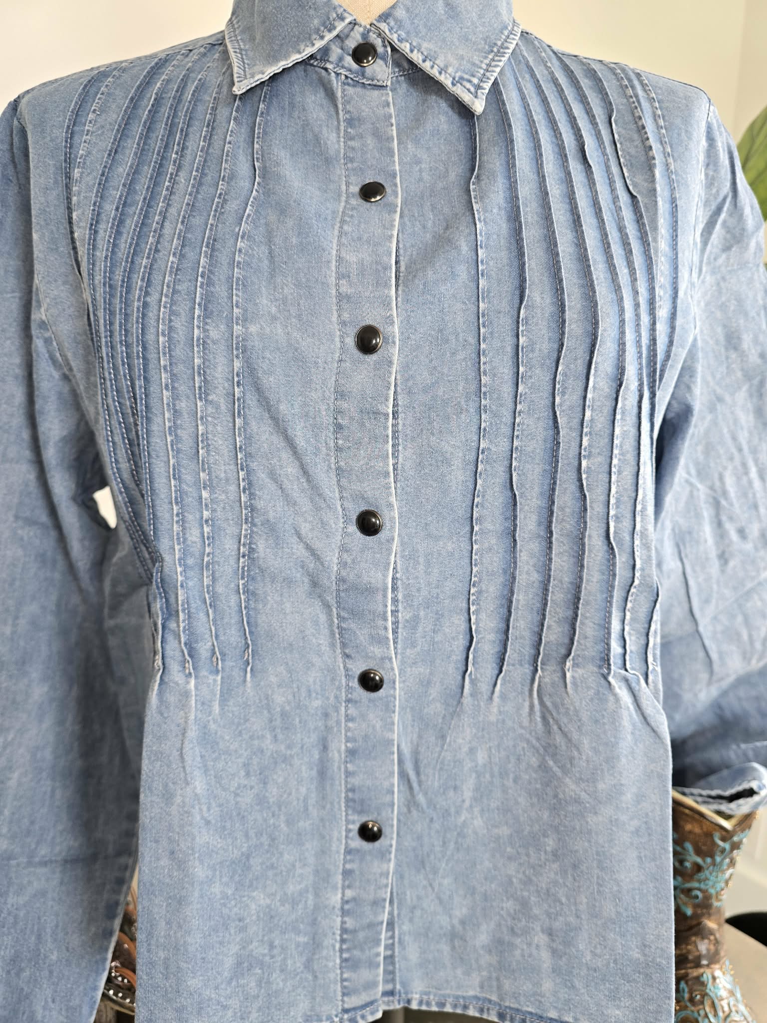it's got the black pearl snaps and pleated front details that take it up a notch from our other denim tops. the pleated detail makes it a SUPER flattering fit.