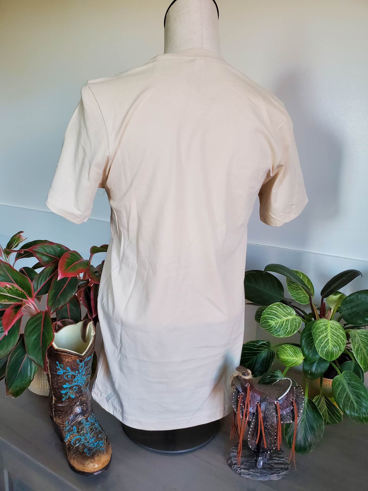The shirt is soft and cream-colored, and features a round-up or western design. This type of shirt is likely to be popular among those who appreciate vintage or western fashion styles. The shirt may be made from a comfortable fabric such as cotton, and may feature images or text that evoke the rugged and adventurous spirit of the American West. Overall, it seems like a fun and stylish choice for anyone looking to add a touch of cowboy flair to their wardrobe.