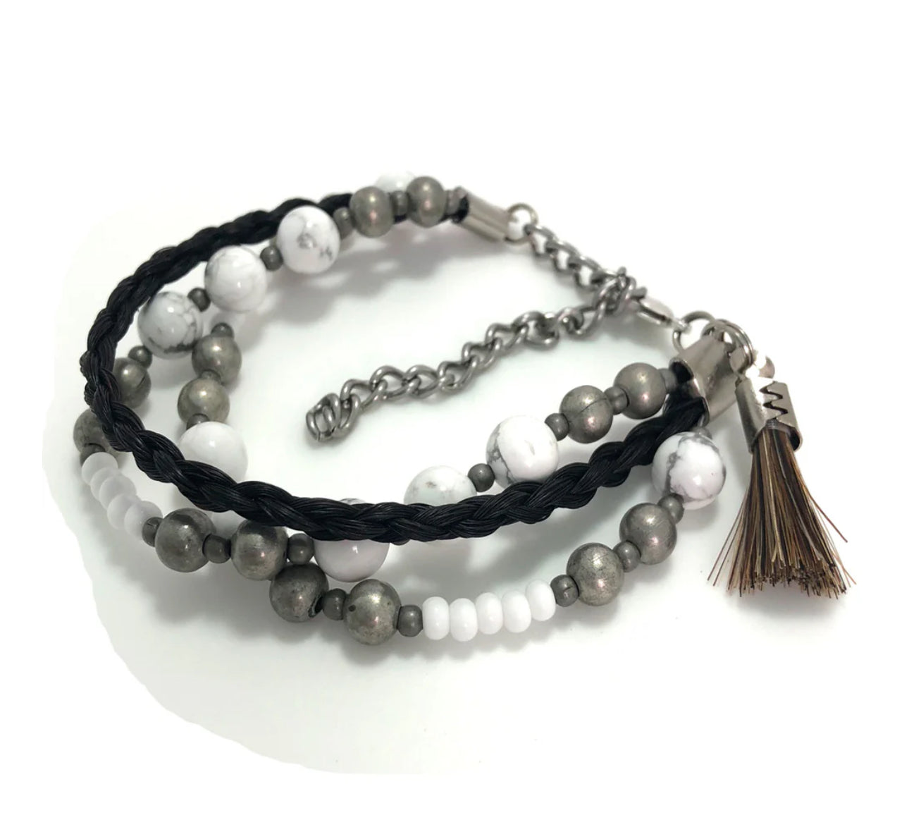 A single spiral of braided horse hair (shade may vary) is encircled by Faux Navajo pearls, white howlite and seed beads. Finished with a tassel of horse hair. Chain and lobster claw closure allows bracelet to adjust in size.