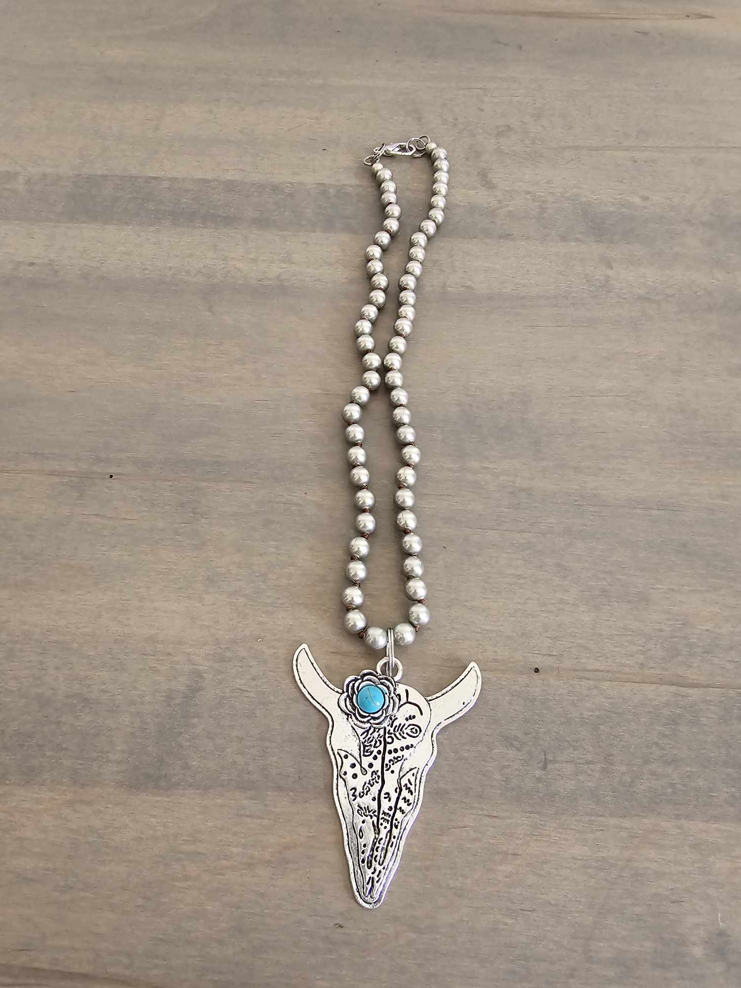 Metal longhorn skull with stamped design and turquoise accent stone. Hanging from faux cowboy beads. Lobster claw closure