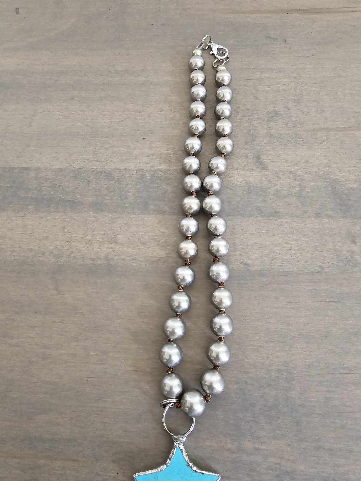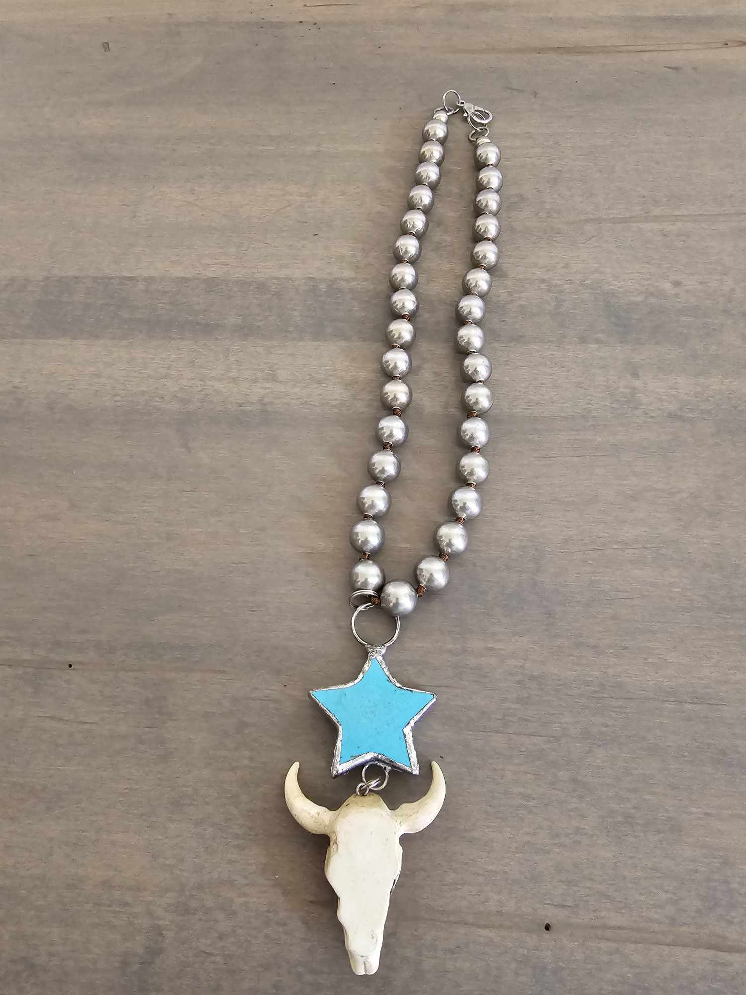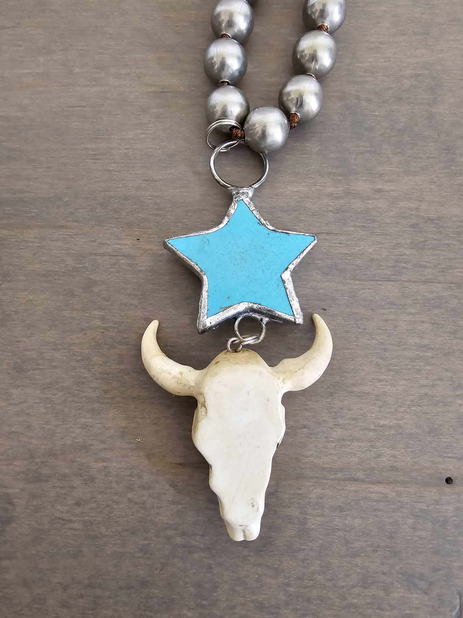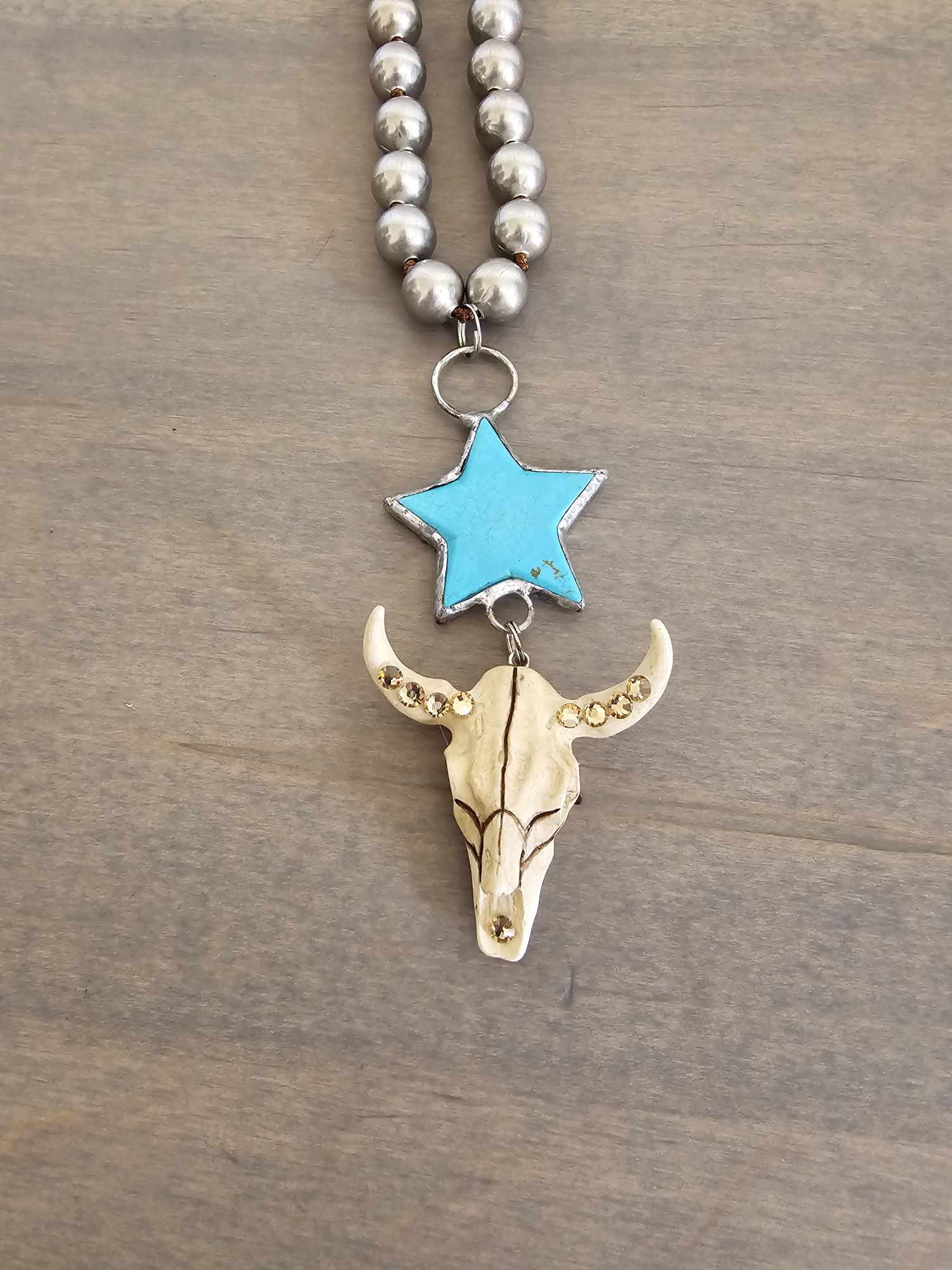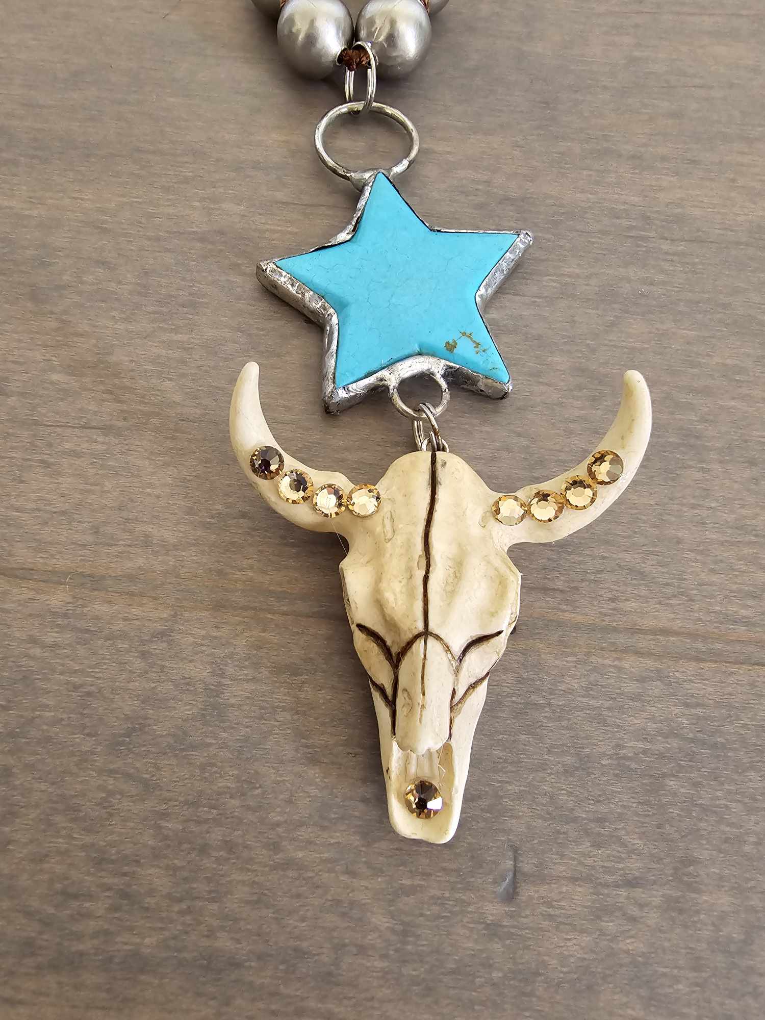 Longhorn skull with rhinestone accents and a Turquoise star. Hanging from faux cowboy beads. Lobster claw closure