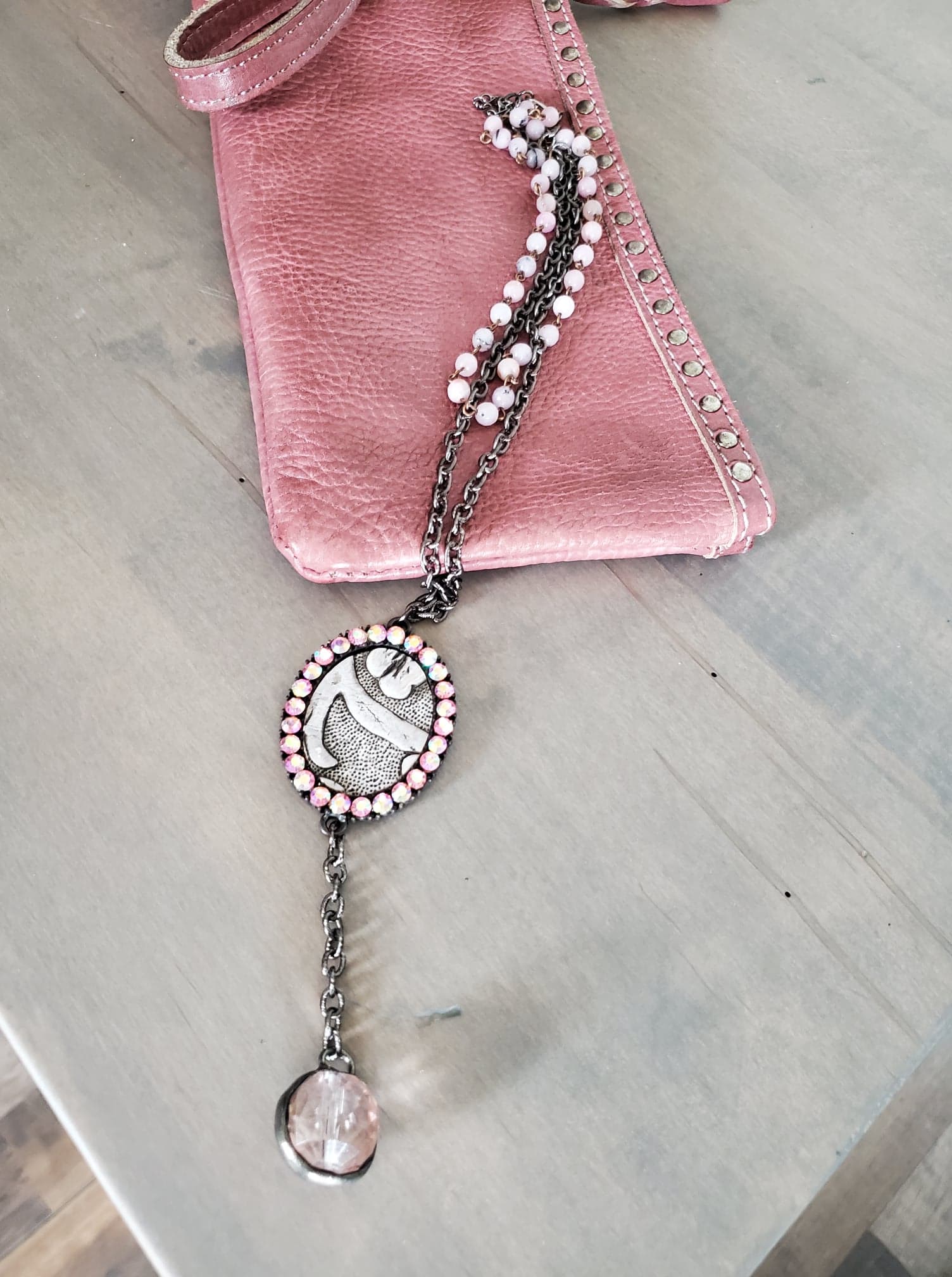 Pink Rose Bead Choker Inside a Long Chain With Grey Leather Embellished with pink Crystal and a Pink Crystal Drop