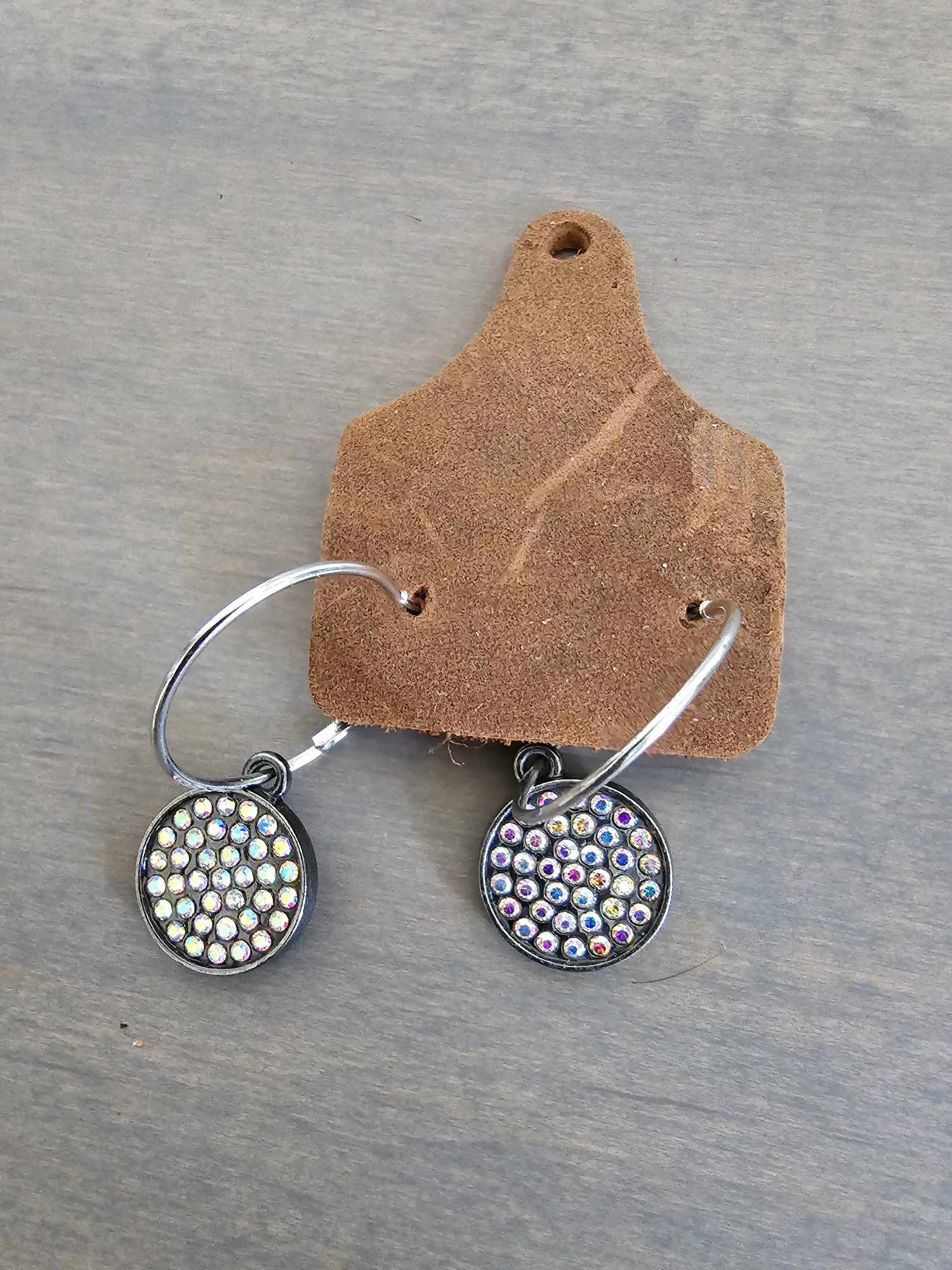 Silver hoop earring with AB crystal embellishments. Paddle back closure