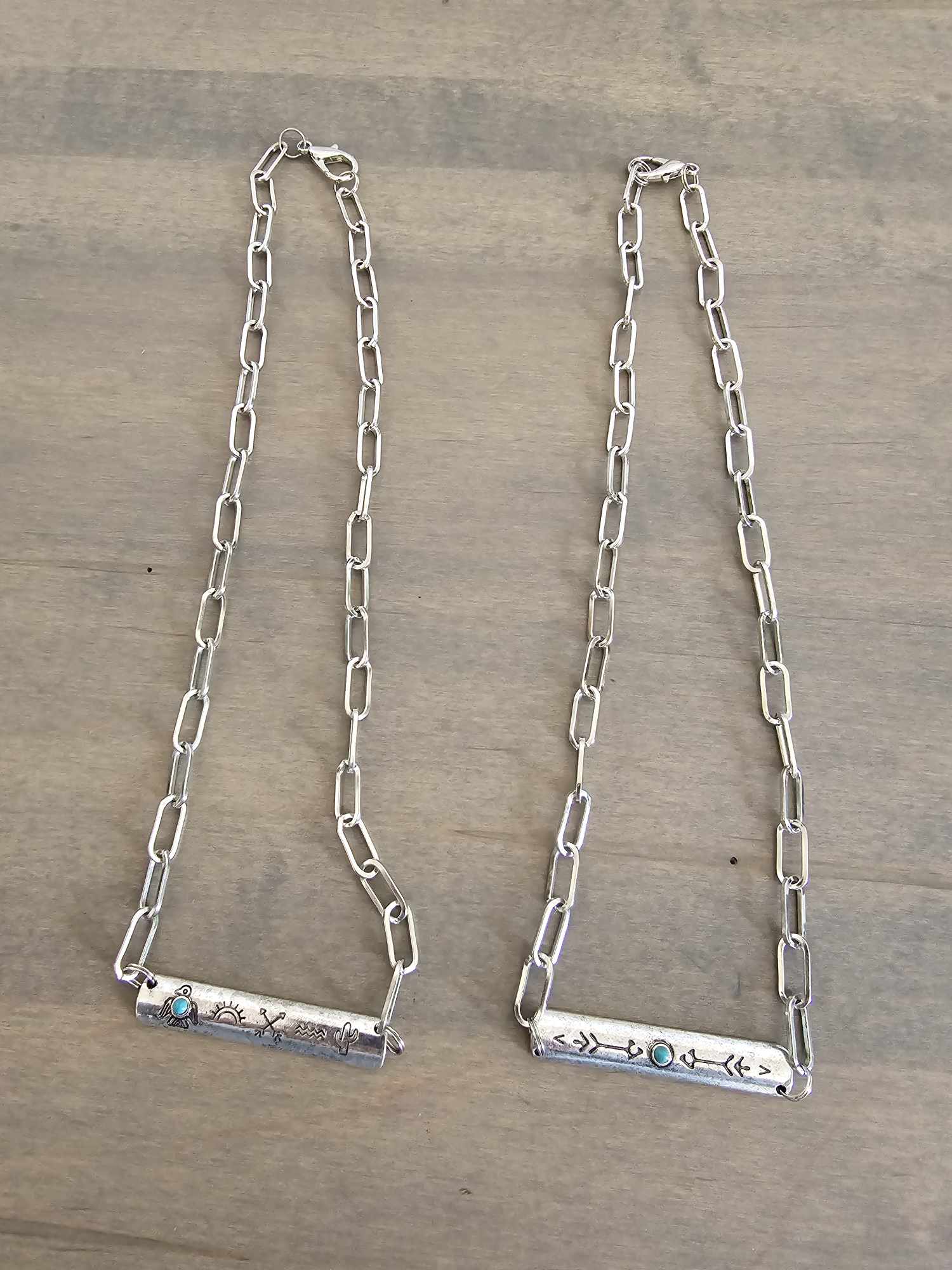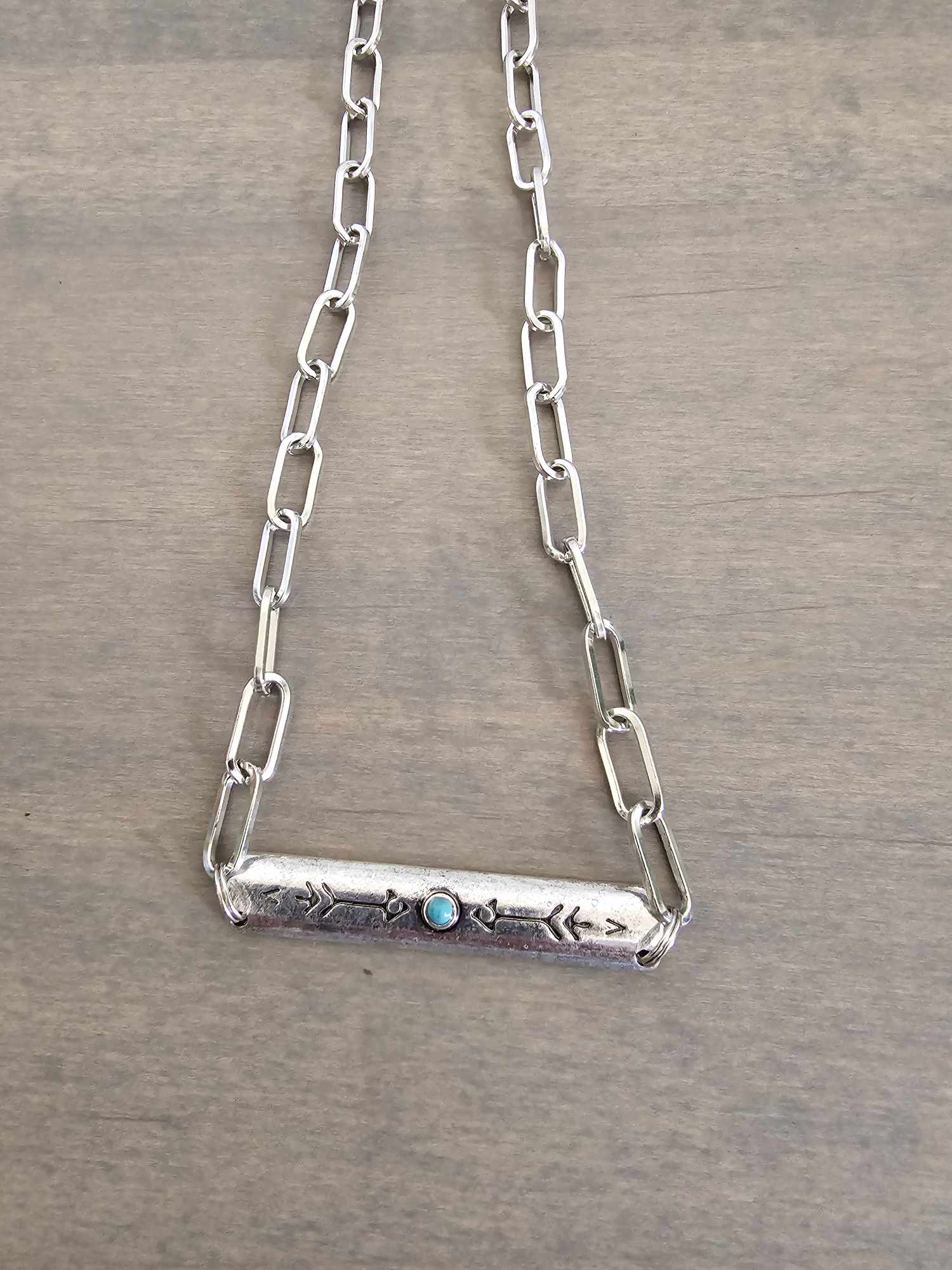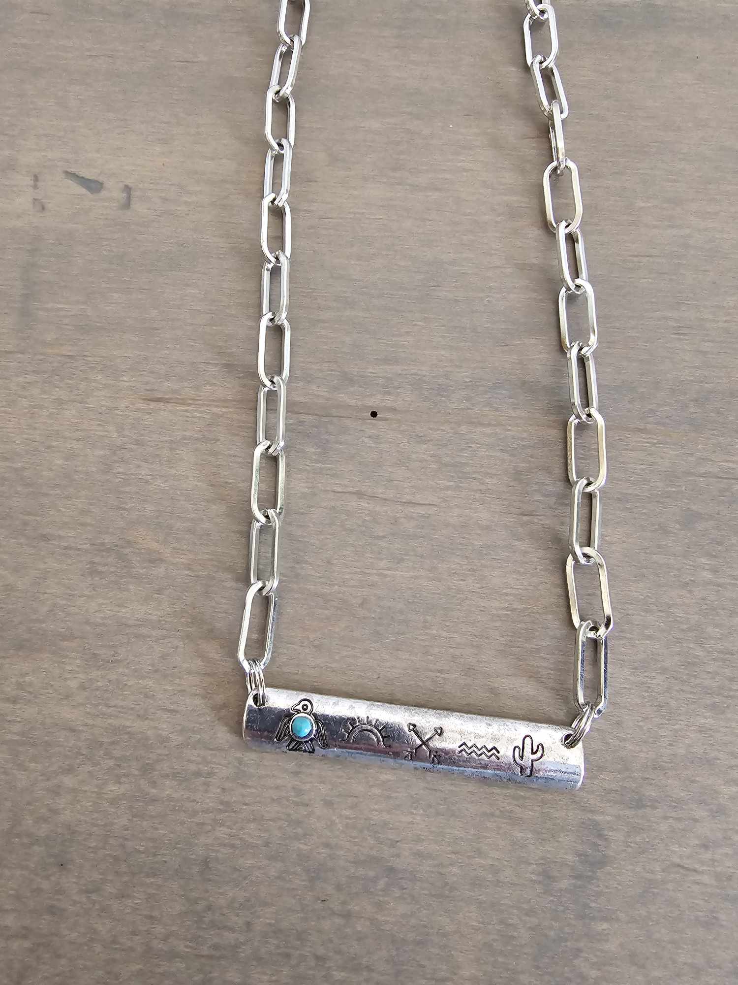 Paper clip link chain with stamped bar pendant and turquoise accent. Lobster claw closure
