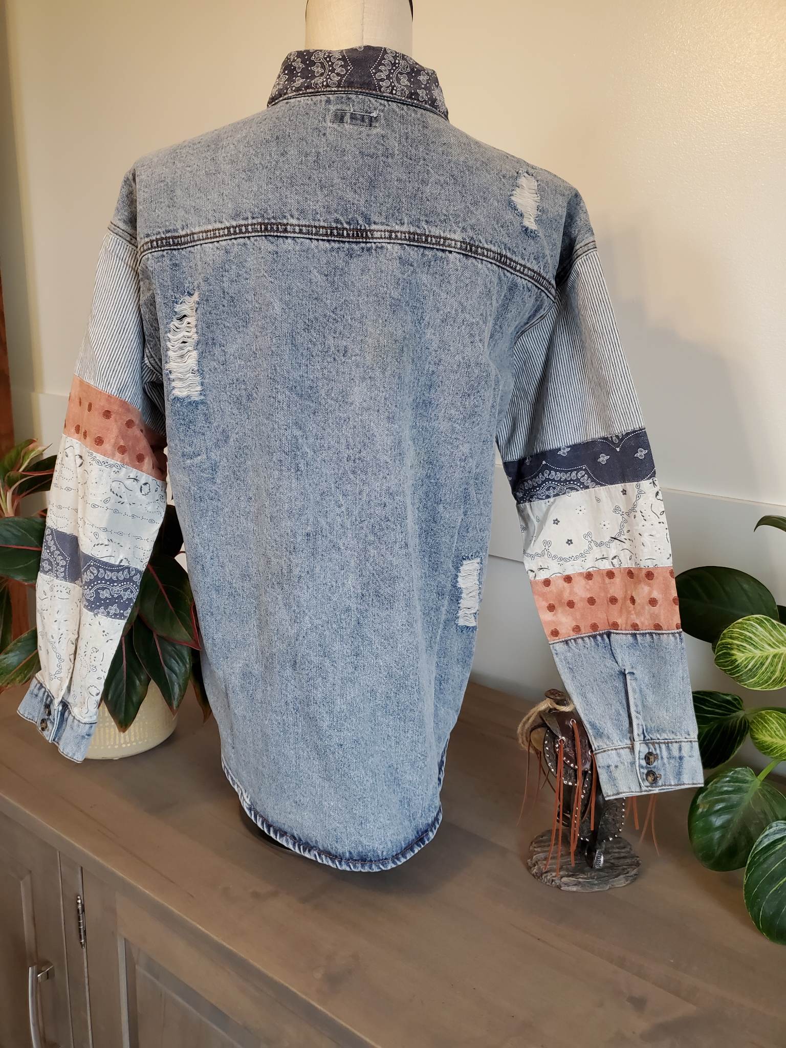 Perfect Spring Jacket or also can be worn as a shirt . Love the distressing. Love the Mixed Print On Sleeve.