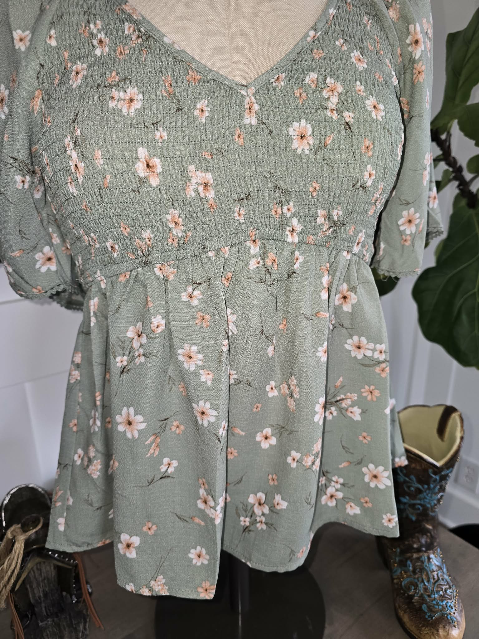Floral printed V-neck peplum style top with flutter sleeves. Hits right at the waistline. True to size