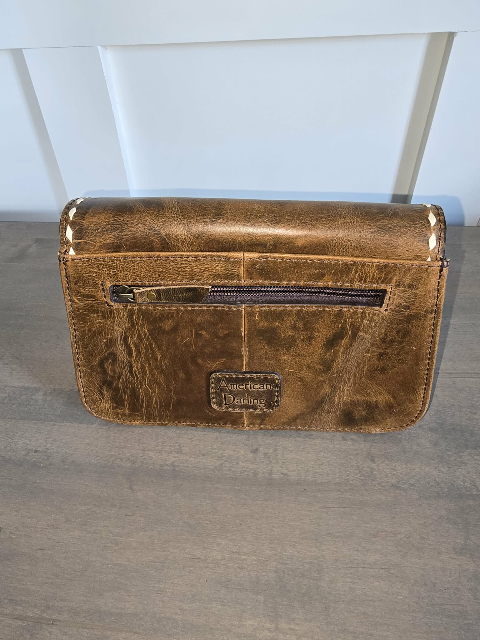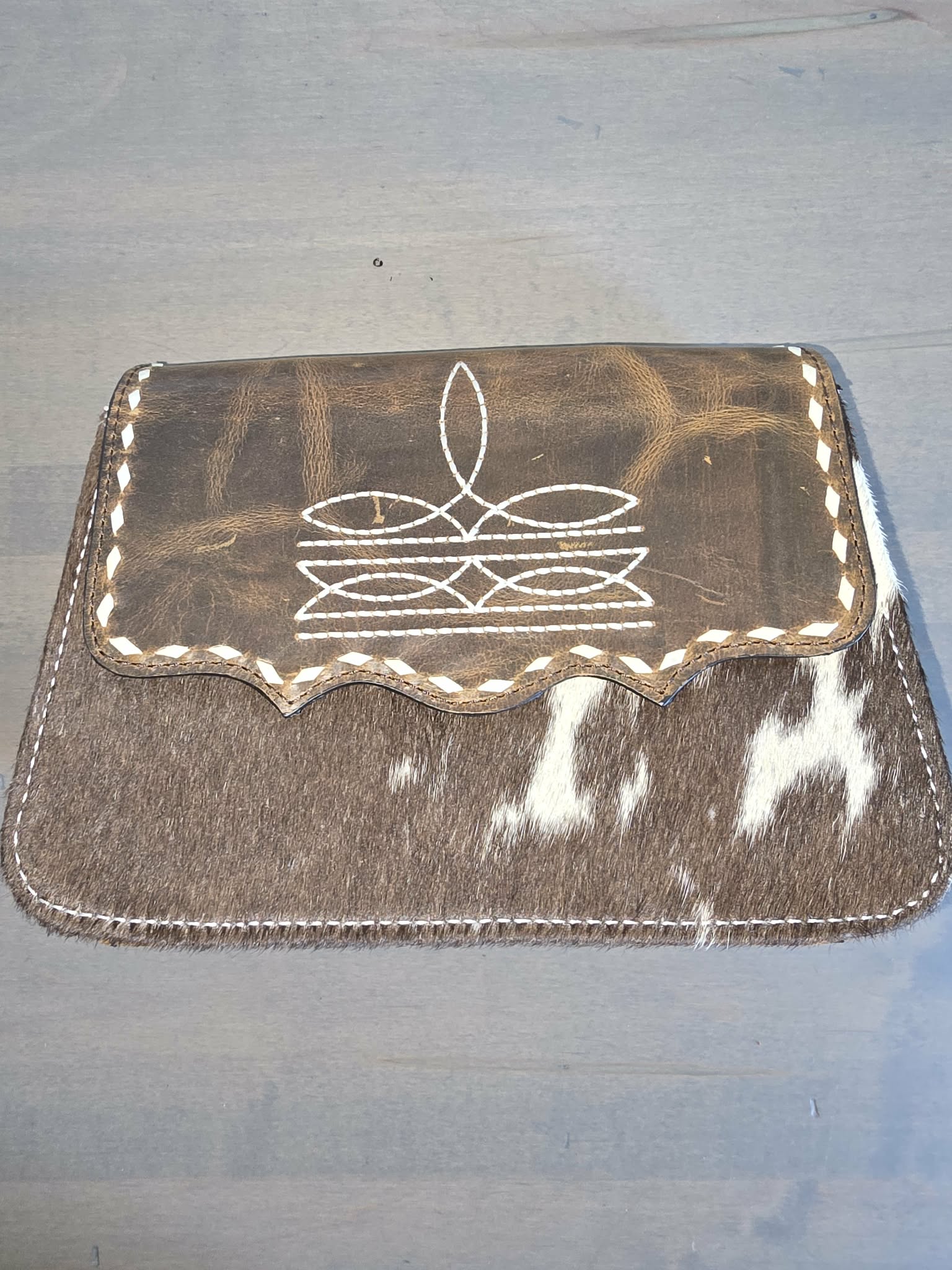 This is a beautiful Bag, Great Boot stitch Front With Hair On Hide. Snap Closure. Genuine Leather back with zippered pocket. Adjustable crossbody strap which is removable. Inside Zippered Pocket. This is a great leather Bag